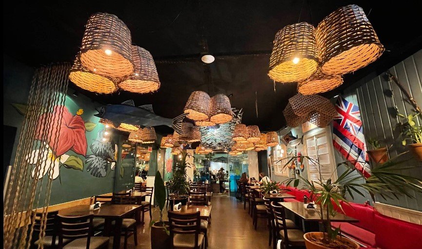 Focado em poke havaiano, com tigelas personalizáveis de peixe, arroz e acompanhamentos, opção mais leve e moderna no centro.